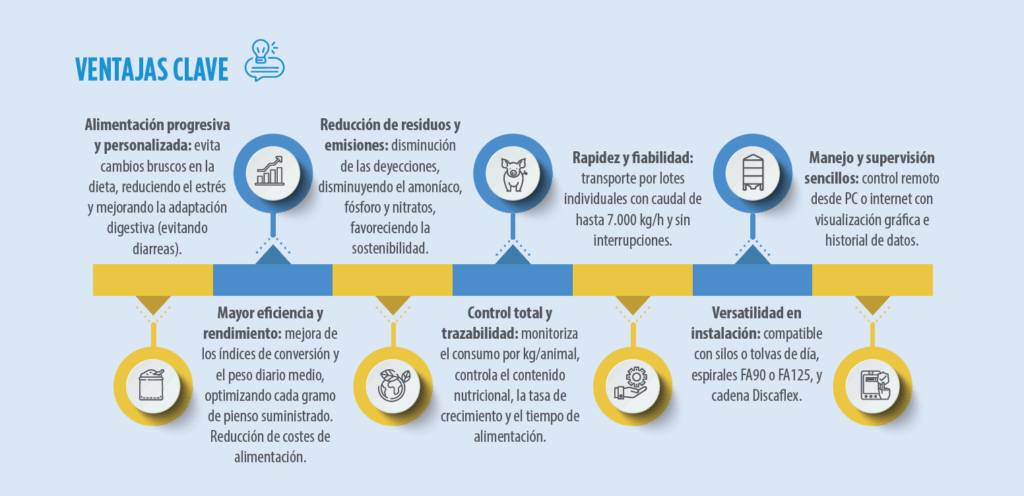 Este sistema permite mezclar varios alimentos o ingredientes en dosificaciones muy precisas, adaptando la ración a cada animal o grupo según sus necesidades en cada fase del ciclo de vida.