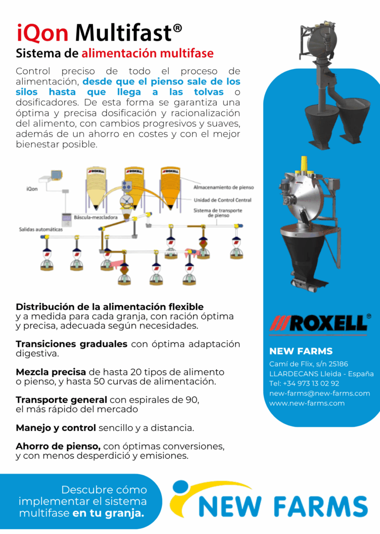 Multifast™ es una solución tecnológica desarrollada por Roxell y distribuida por New Farms, diseñada para ofrecer una alimentación flexible, precisa y rápida. Es el sistema más veloz del mercado, capaz de manejar hasta 7.000 kg/h, lo que lo hace ideal para explotaciones de cualquier tamaño que busquen optimizar tiempos y rendimiento.